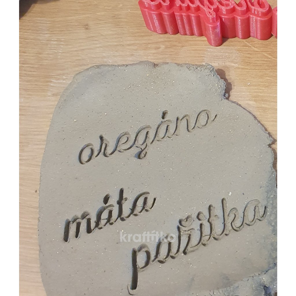 Jméno bylinky se krásně obtiskne do keramické hlíny či samotvrdnoucí hmoty. Vyrobte si doma či v kroužku s dětmi jednoduše zápichy a zkrášlete si vaši bylinkovou zahrádku či květináč.