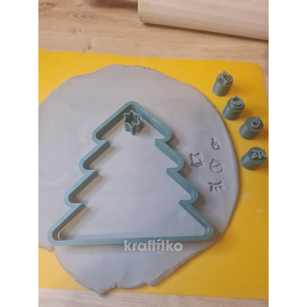 Obsahuje: Stromeček obrysové vykrajovátko, 4 ks razítek, 1 malé vykrajovátko hvězdička, 2ks koleček